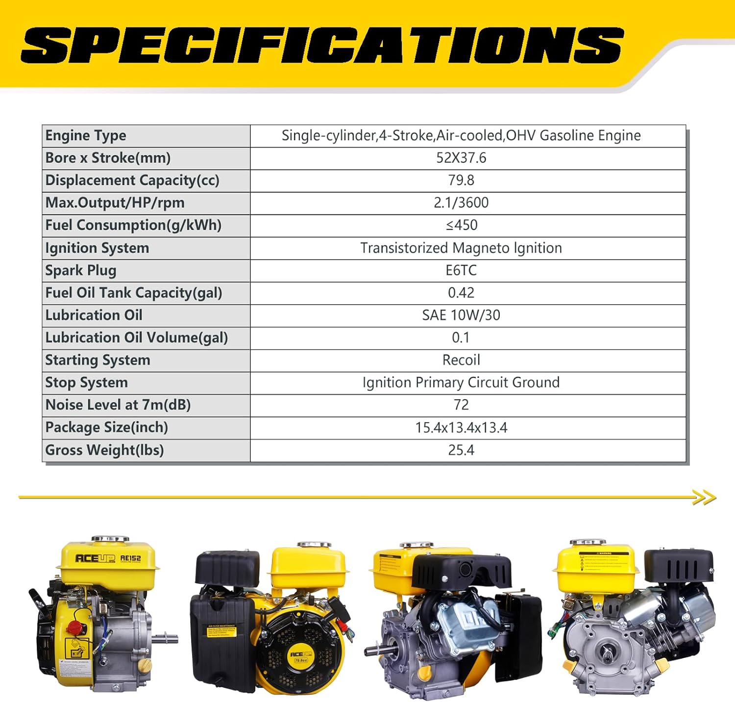 Motor de gasolina pequeño Aceup Energy de 2,1 HP y 79,8 cc con eje horizontal y motor de gasolina OHV de 4 tiempos