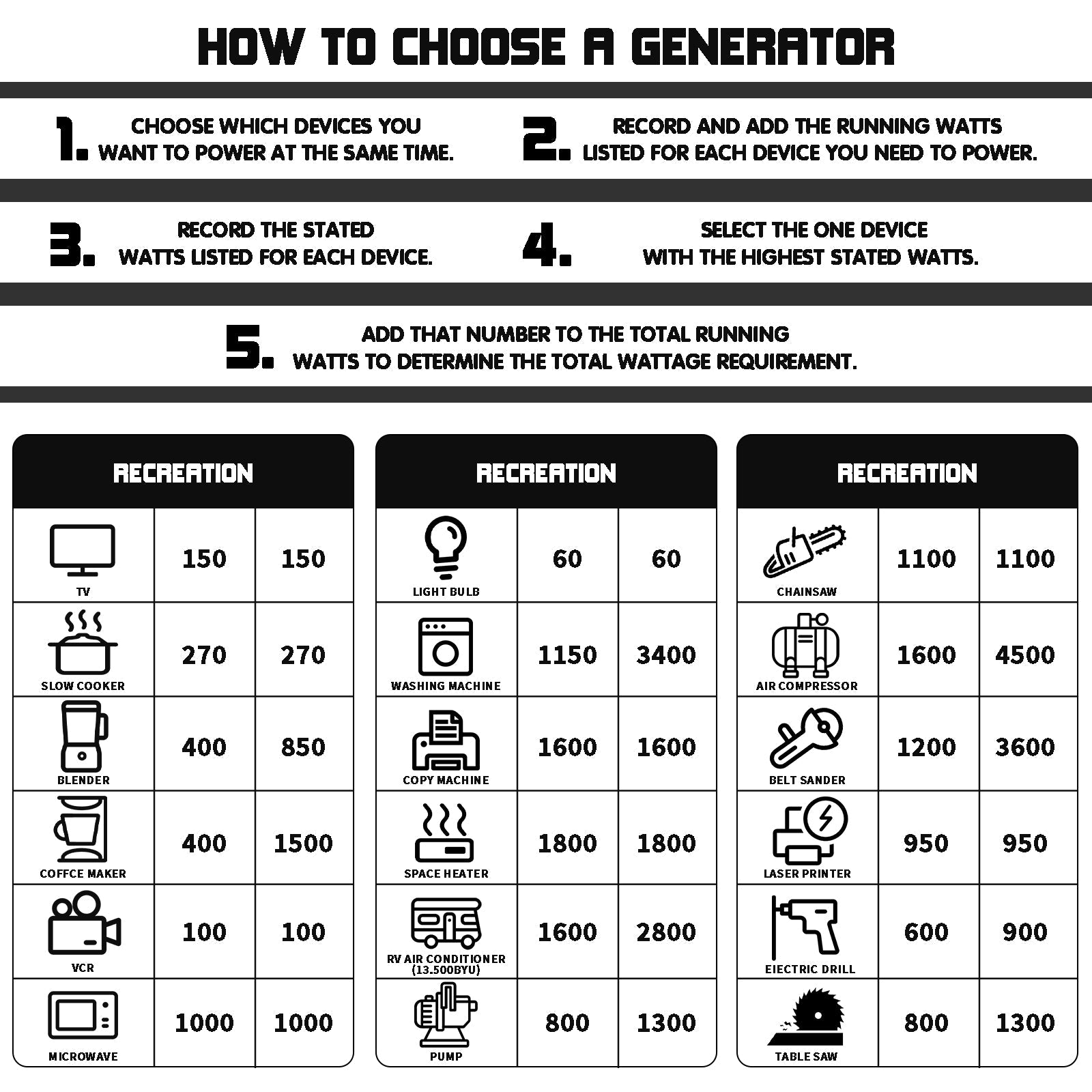Power & Efficiency: 149cc 4-stroke OHV engine produces 4000 peak watts and 3200 rated watts with recoil start for up to 8 hours at 1/2 load on 1.32 gallon, 60Hz.