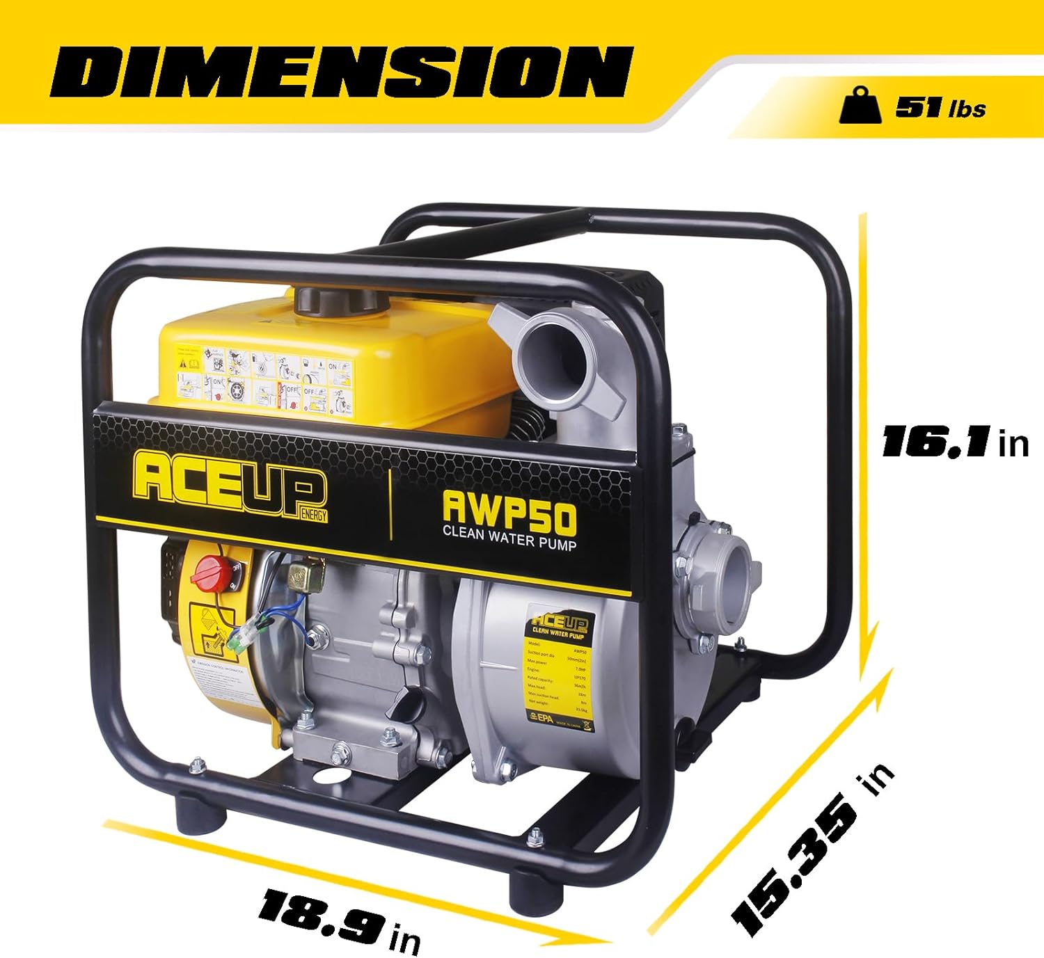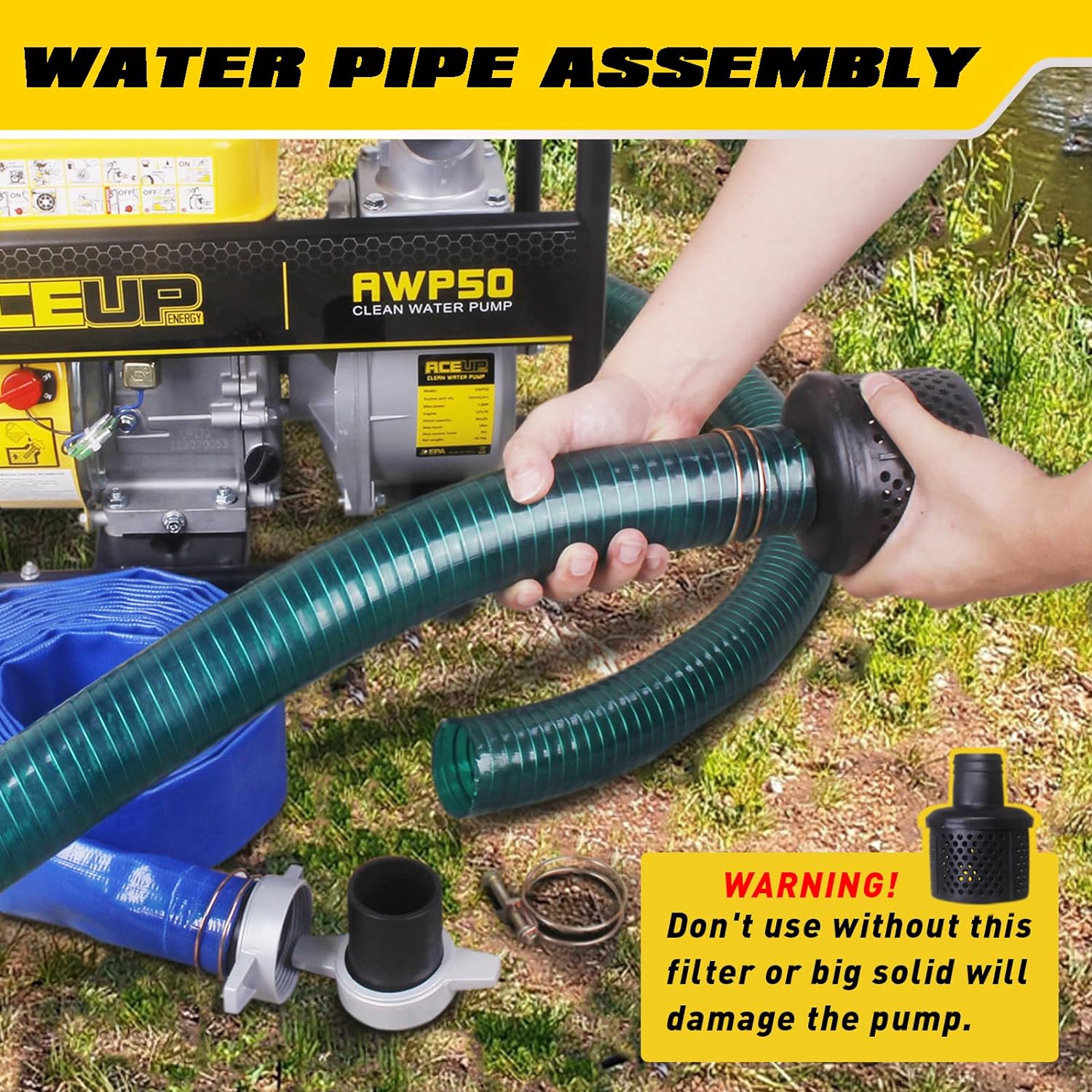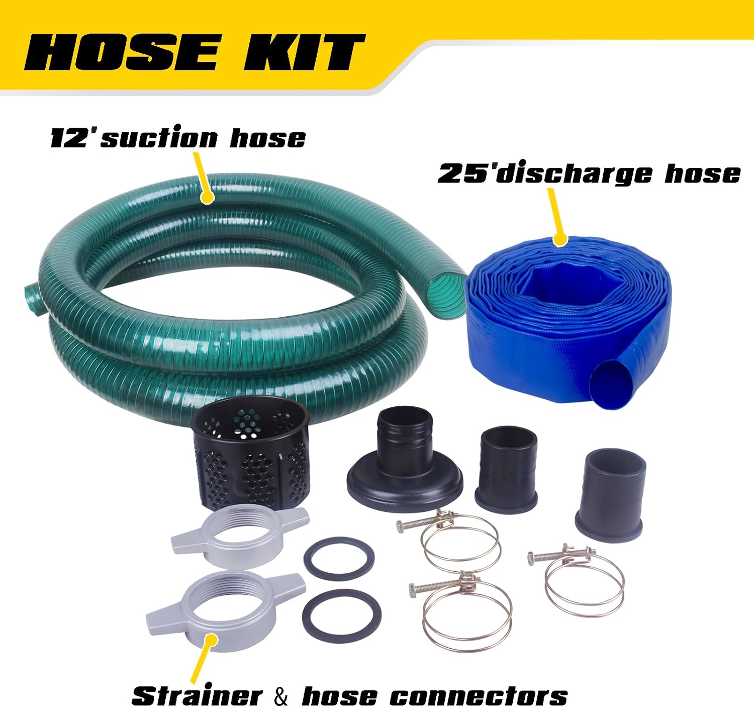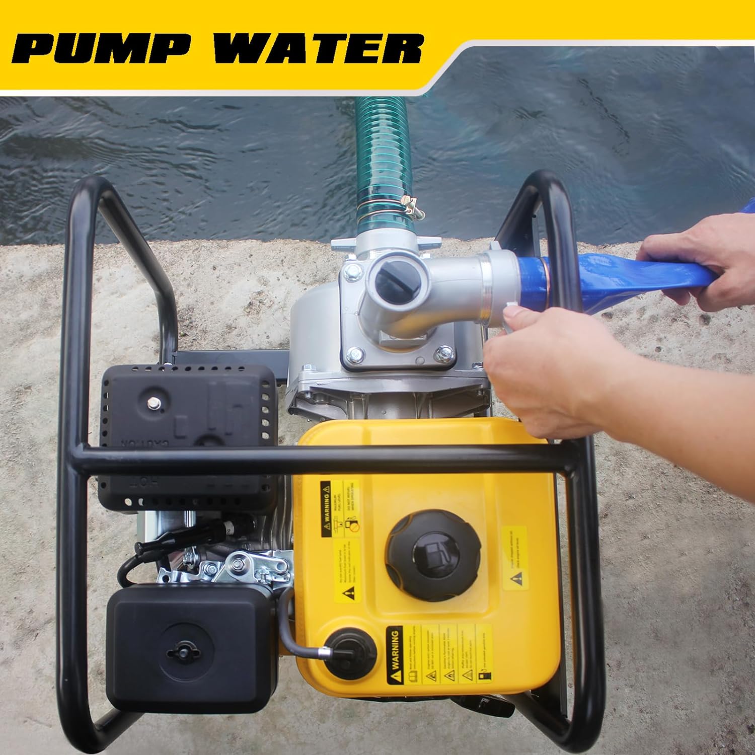 3. Fácil de usar: Esta bomba de agua portátil se inicia manualmente con un retroceso; antes de usarla, debe agregar agua a la bomba para que nuestro motor de combustión interna pueda funcionar correctamente; el tubo de succión es de 12 pies y la manguera de descarga es de 25 pies