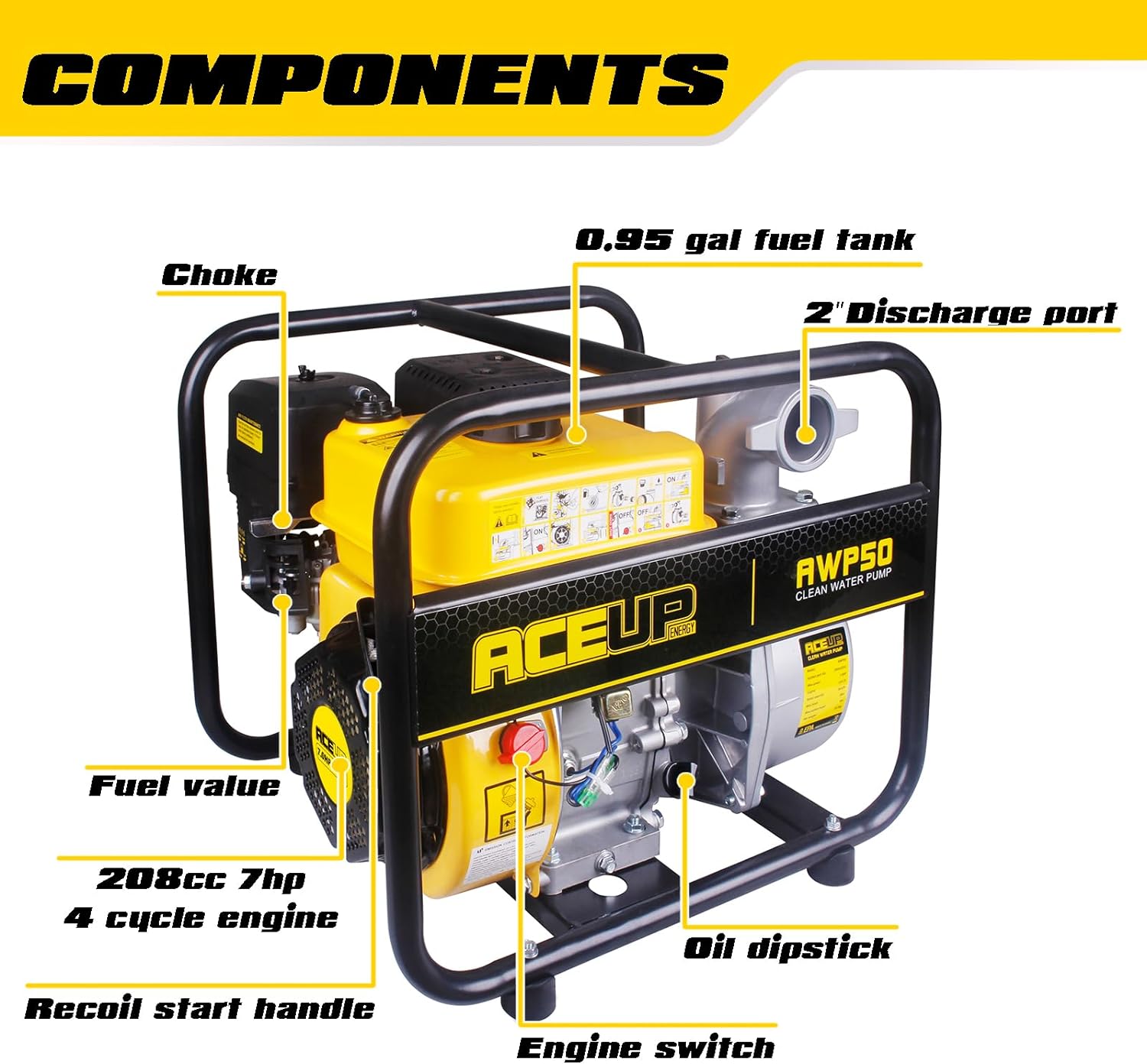 1. Potente accionamiento: Las bombas de transferencia de agua tienen 7 caballos de fuerza y bombas centrífugas tipo paletas de hasta 3600 rpm; una altura máxima de 95 pies y una succión máxima de 27 pies, motor de 4 tiempos de 208 cc, que ayuda a regar rápidamente.